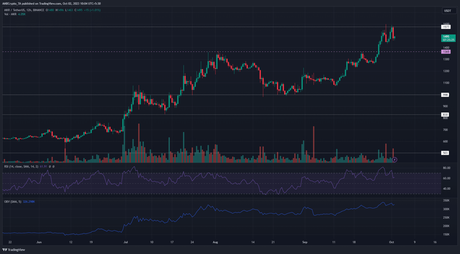 A pesar del doble retroceso experimentado en la resistencia de $ 1,577 durante las últimas 48 horas, MKR mantuvo su tendencia alcista en los marcos de tiempo inferiores y superiores.