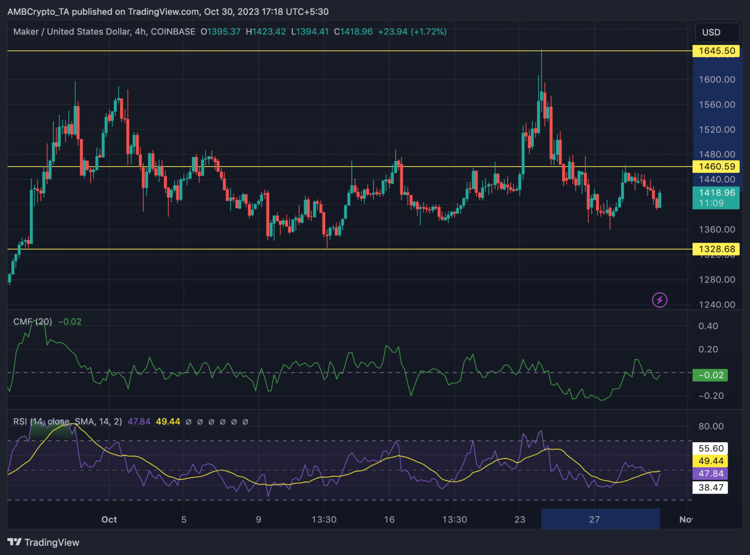 Además, hablando del precio de MKR, se vio que su precio bajó un 11,78% desde el 24 de octubre. Sin embargo, al alejarse y mirar el panorama más amplio, se vio que el precio de MKR se movía lateralmente. No se había establecido ninguna tendencia alcista o bajista específica. En el momento de escribir este artículo, MKR cotizaba a 1.418,29 dólares.