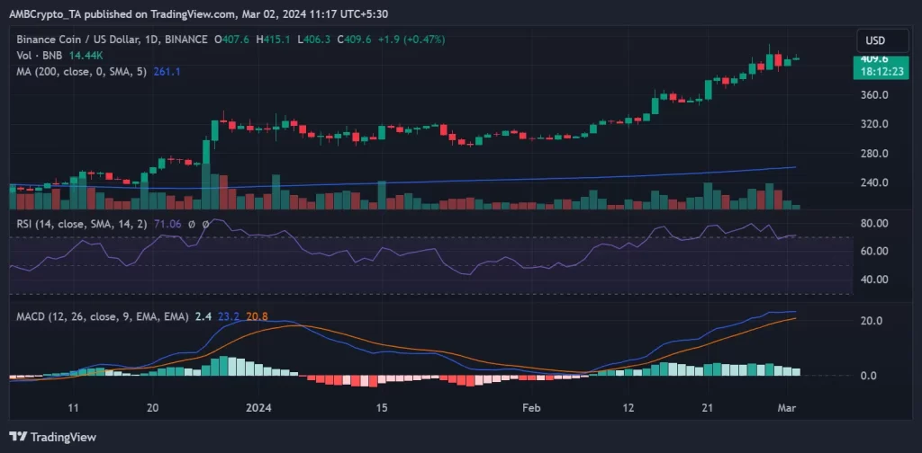 El gráfico mostraba que el 1 de marzo, BNB cotizaba a unos 407 dólares, lo que refleja un aumento de valor de más del 2%. Este repunte fue particularmente notable, considerando que había experimentado una caída de alrededor del 3,7% el día anterior, cayendo por debajo de la marca de 400 dólares.