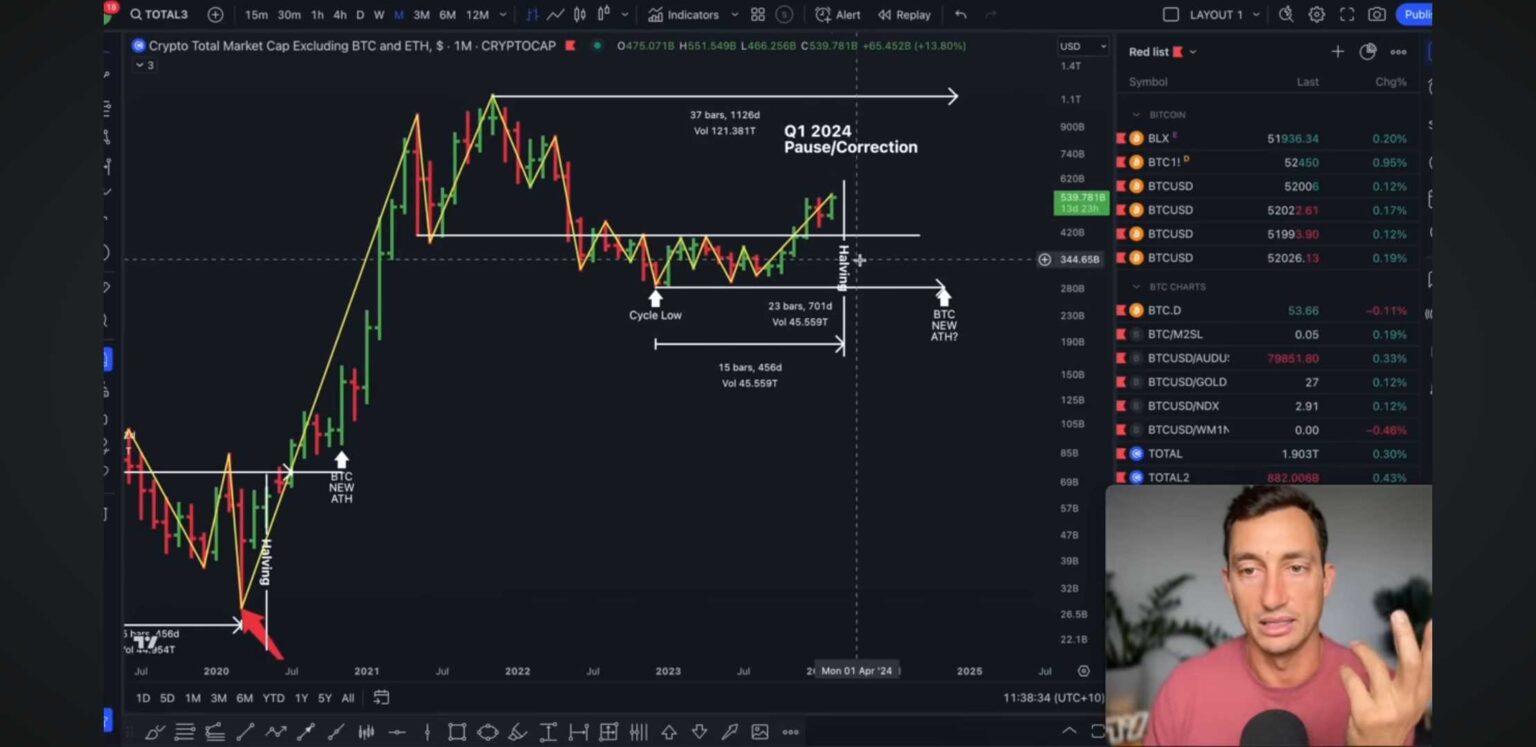 Pizzino dice que está mirando el gráfico mensual de TOTAL3, que rastrea la capitalización de mercado total de los criptoactivos, excluyendo Bitcoin (BTC), Ethereum (ETH) y monedas estables. Según el comerciante, TOTAL3 se encuentra ahora en medio de una fase de consolidación en preparación para un estallido alcista, lo que sugiere que es poco probable una corrección severa en el mercado de altcoins.