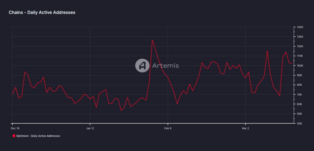 Sorprendentemente, esto sucedió la misma semana en que se llevó a cabo la actualización Dencun de Ethereum. La actualización de Dencun fue una gran noticia para los usuarios de L2, ya que AMBCrypto confirmó que las tarifas del gas eran más bajas en las redes. Como resultado, las transacciones sobre Optimismo se dispararon. Residencia en datos de artemisala plataforma de criptoanálisis, las direcciones activas diarias en la red alcanzaron las 114.200 el 15 de marzo.