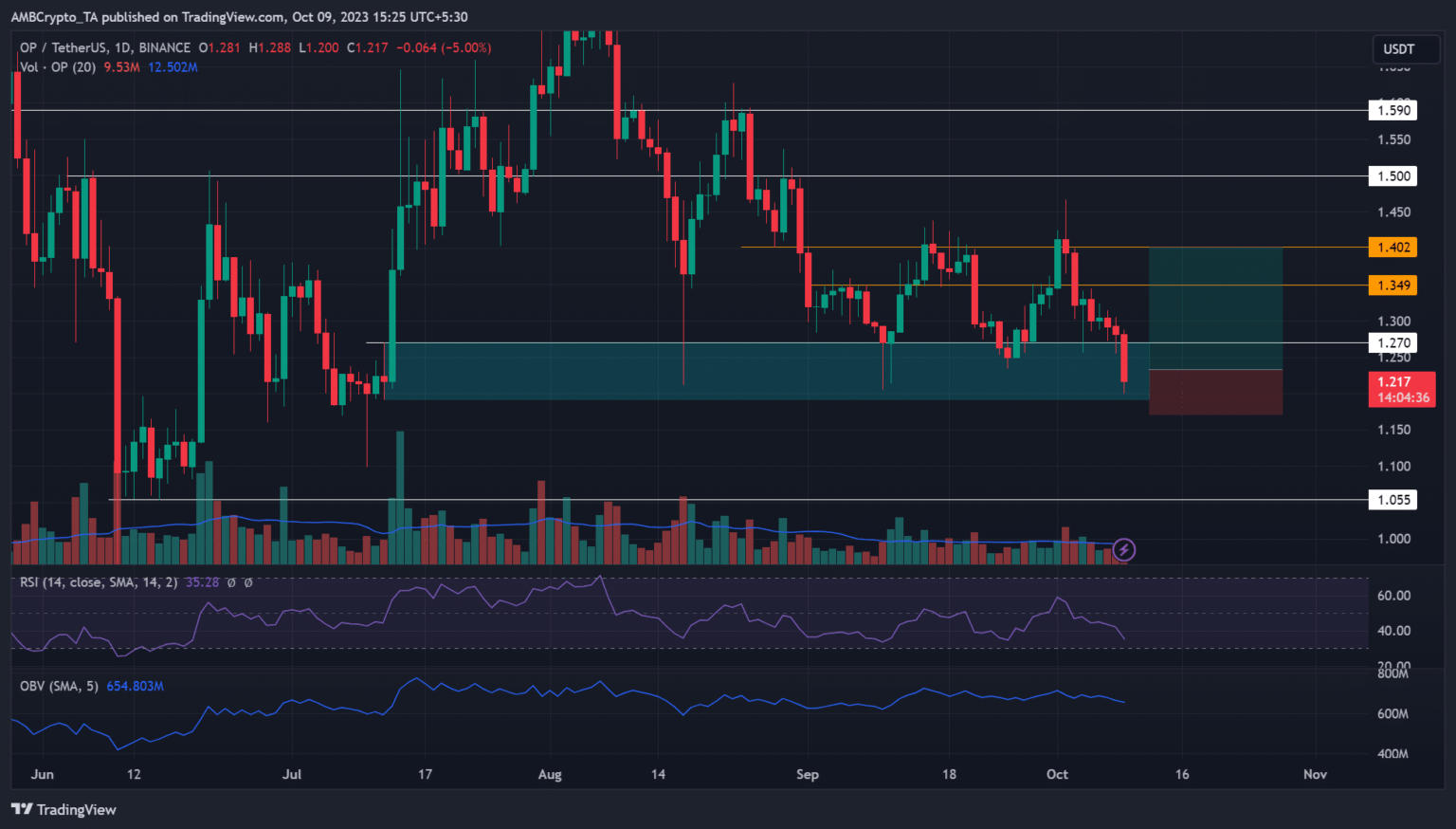 En el último trimestre (T3), Optimismo [OP] los compradores han explotado la zona de soporte crucial de $1,19 – $1,27 (cian). Al cierre de esta edición, el reciente retroceso alcanzó el soporte del tercer trimestre y podría atraer compradores.