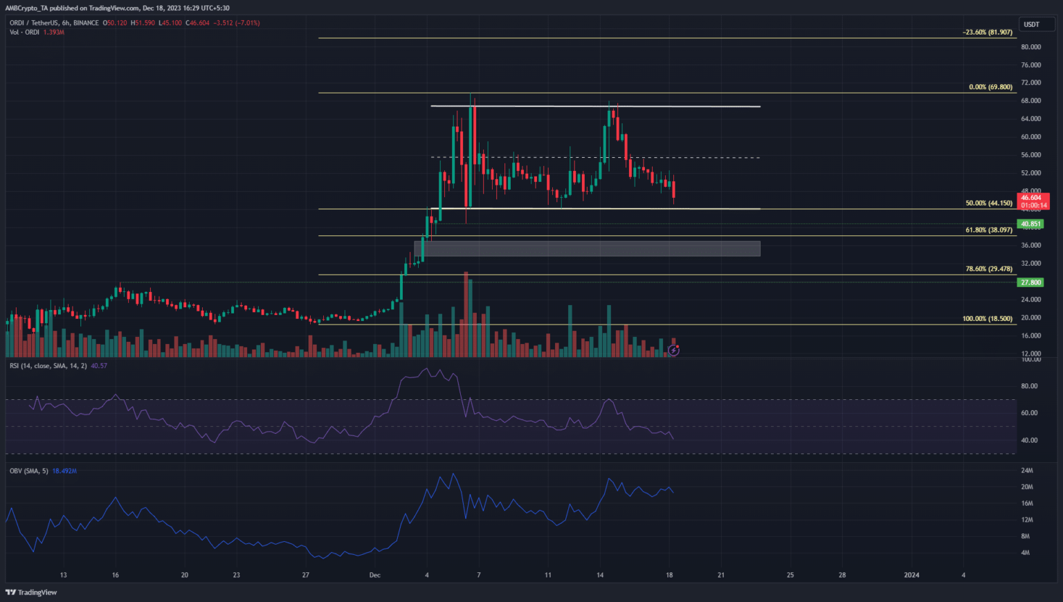 Este rango (blanco) se extendió de 44,15 dólares a 66,9 dólares, donde ORDI enfrentó una fuerte resistencia una vez más el 14 de diciembre. Además, el nivel medio de 55,52 dólares ha servido como una resistencia confiable durante este período.