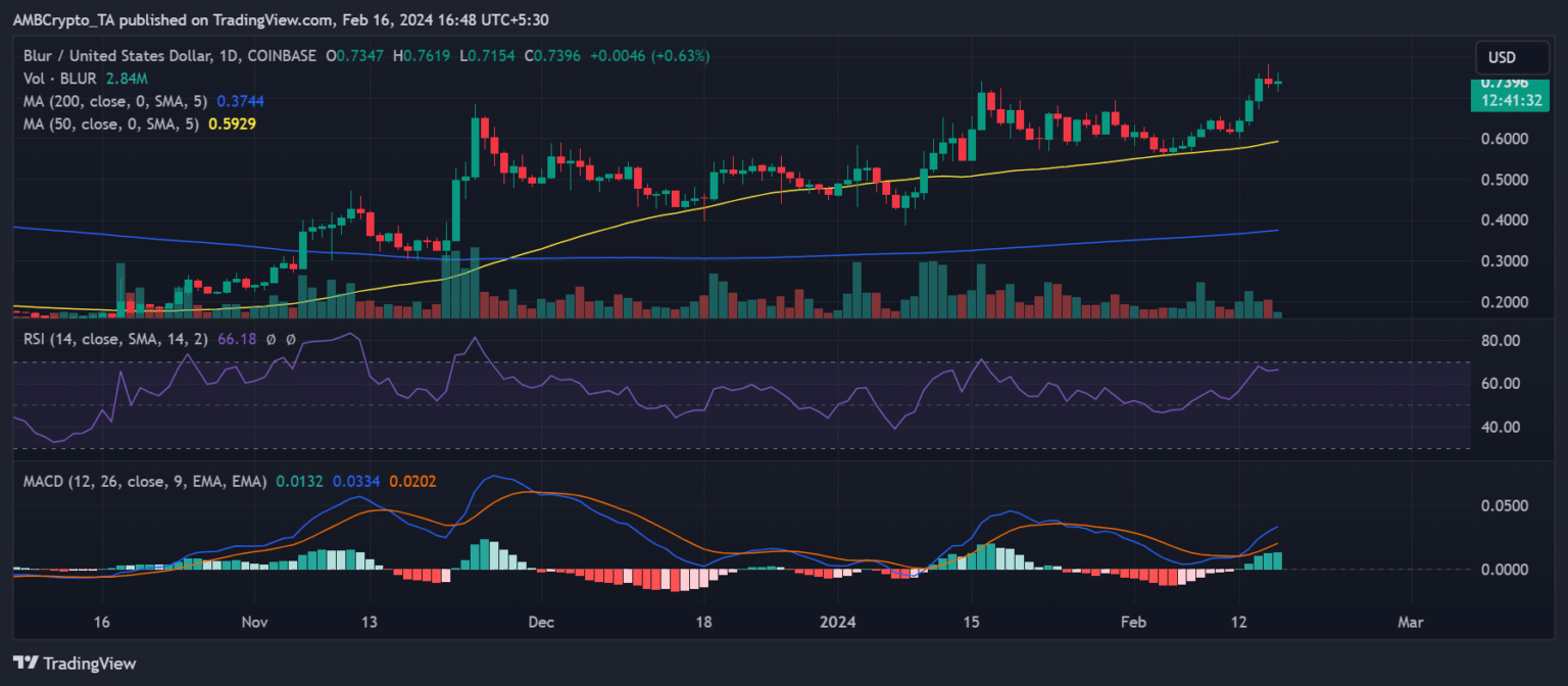Un análisis del gráfico diario mostró que BLUR comenzó a mostrar tendencias ascendentes el 5 de febrero. Los aumentos más significativos se produjeron los días 13 y 14 de febrero, con un aumento de más del 15% y cotizando a aproximadamente 0,74 dólares.