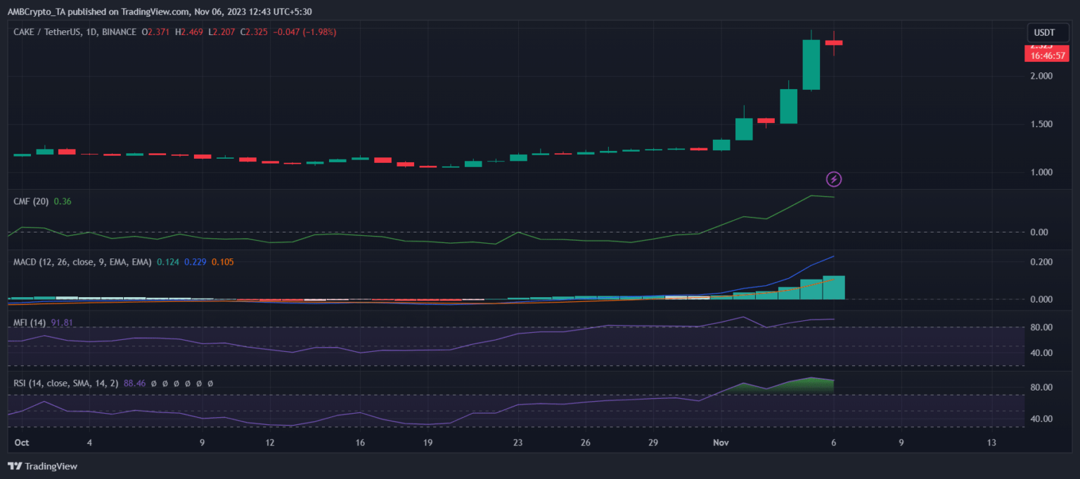 - El gráfico diario de CAKE estaba en verde y el sentimiento del mercado también se mantuvo alcista.