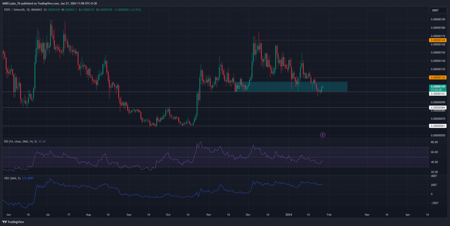 Pepe [PEPE] cayó un 35% del 11 al 24 de enero. Su estructura de mercado bajista está vigente desde el 3 de enero. En el momento de esta publicación, cotizaba en una zona de soporte que los alcistas del PEPE han defendido desde noviembre de 2023.