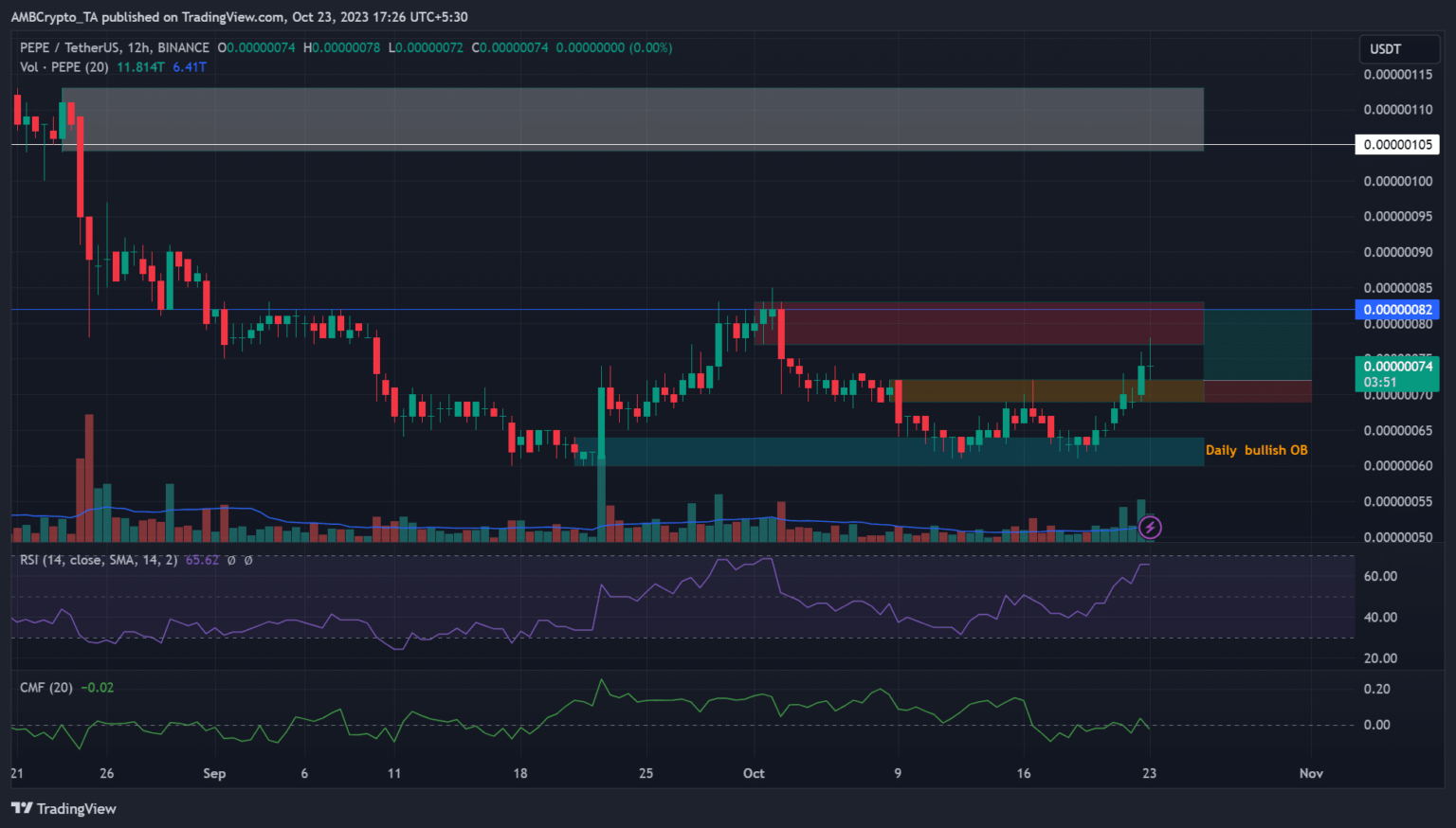 El objetivo alcista será el OB bajista del gráfico diario de $0,00000077 – $0,00000083 (rojo). Una nueva prueba del obstáculo anterior podría presentar una ganancia potencial del 13%.