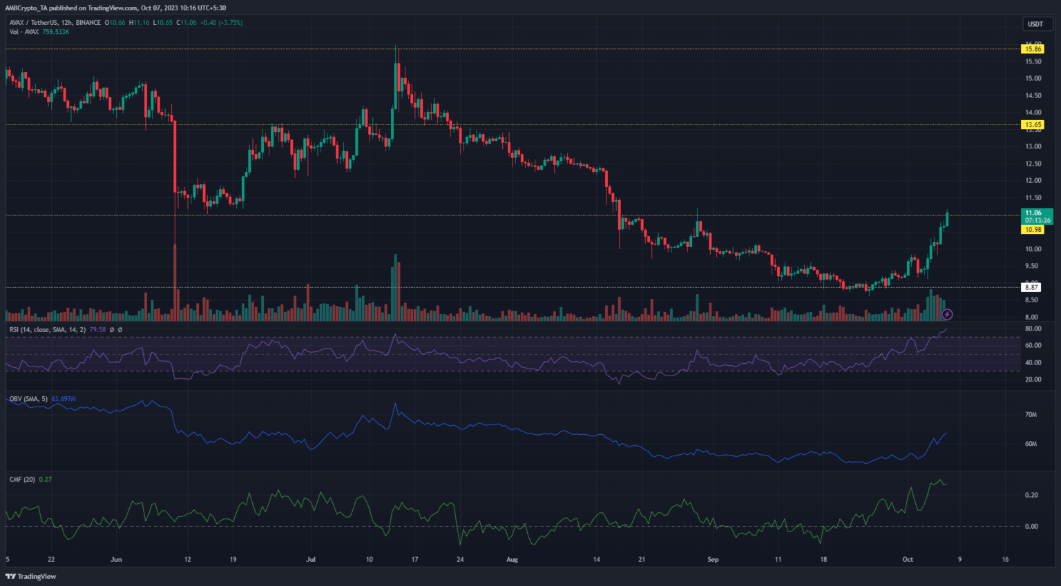 avalancha [AVAX] continuó su repunte alcista con un aumento del 10% durante el último día. Esto lo llevó al nivel de resistencia de $11. A principios de agosto, AVAX fue rechazado en este nivel de resistencia. Por lo tanto, una ruptura alcista del nivel sigue siendo fundamental para sostener el repunte alcista.