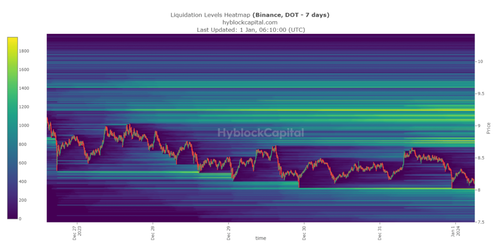 El token fue testigo de un aumento masivo en la liquidación cerca de la marca de $9,2, después de lo cual su precio comenzó a caer. La liquidación de Polkadot luego aumentó cuando su valor alcanzó los 8,6 dólares, lo que provocó una nueva caída del precio.