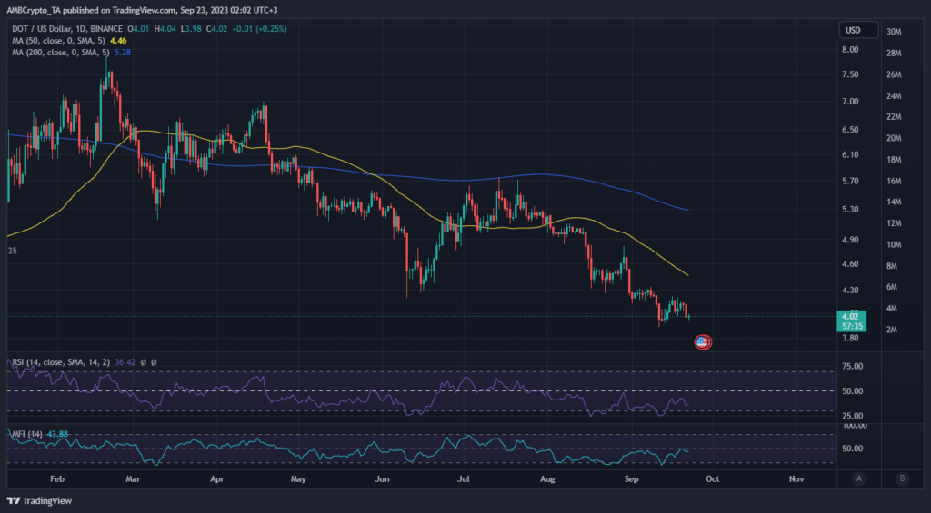 Los planes de Polkadot y los desarrollos en curso subrayan la probabilidad de éxito a largo plazo, especialmente a mediano y largo plazo. ¿Pero es esto suficiente para facilitar un cambio de sentimiento? La acción del precio del DOT ha seguido una trayectoria descendente desde febrero. Alcanzó un nuevo mínimo de 2023 de 3,91 dólares el 11 de septiembre y cotizaba a 4,02 dólares en el momento de esta edición.
