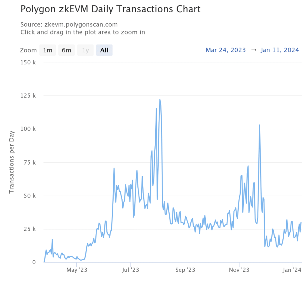 Un examen exhaustivo de las transacciones en Polygon zkEVM escáner ha revelado una disminución gradual en el número de transacciones diarias a lo largo del tiempo.