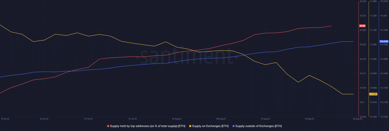 Según Santiment, ETHLa oferta de las bolsas cayó sustancialmente mientras que su oferta fuera de las bolsas aumentó. Además, la confianza de las ballenas en el rey de las altcoins era alta a medida que aumentaba el suministro de las principales direcciones.
