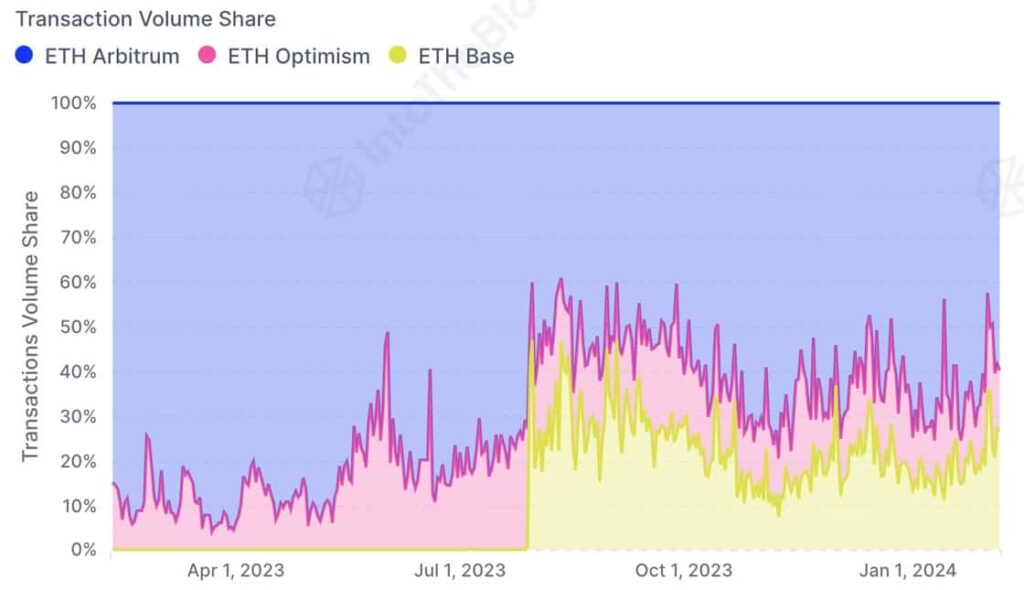 Según la firma de análisis en cadena IntoTheBlock, la cadena de bloques de capa 2 (L2) representó más del 50% del volumen total de transacciones de ETH en los principales acumuladores optimistas, incluido Optimism. [OP] y base.