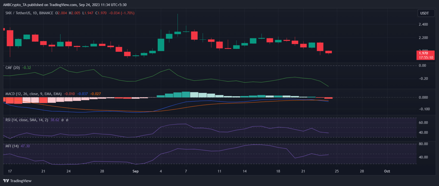 De acuerdo a CoinMarketCap, en el momento de escribir este artículo, SNX cotizaba a 1,98 dólares con una capitalización de mercado de más de 534 millones de dólares. Una mirada al gráfico diario del token ayudó a comprender mejor lo que estaba sucediendo.