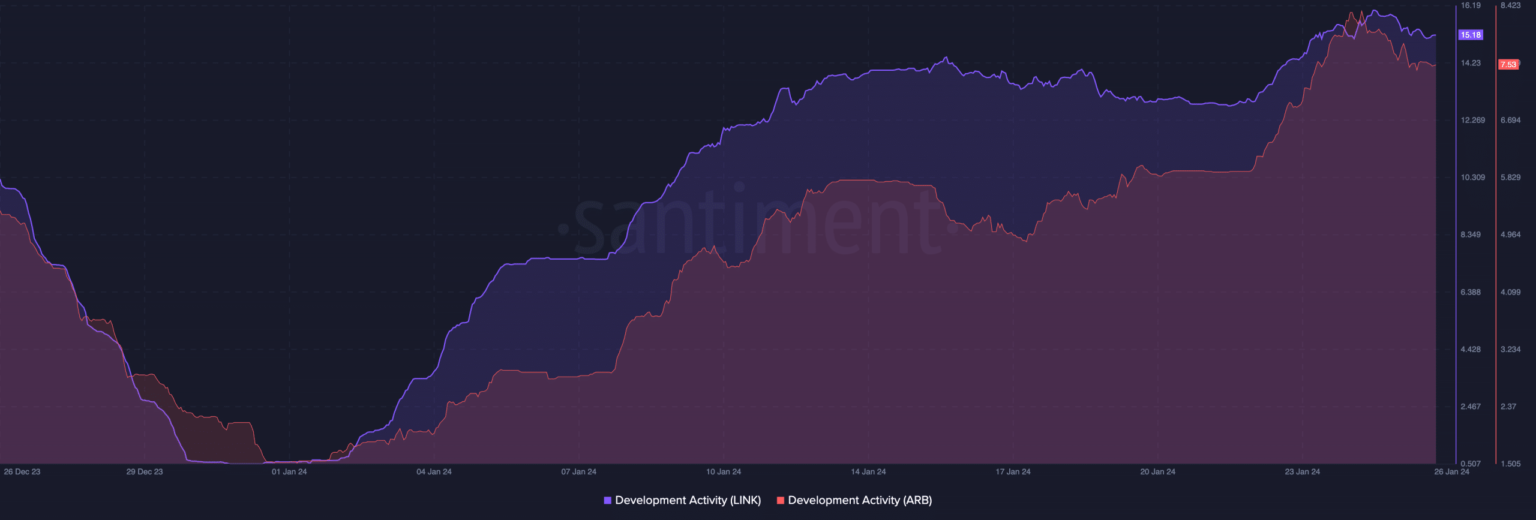 Además, AMBCrypto entonces miró en la actividad de desarrollo en ambos extremos. Al cierre de esta edición, los datos de Santiment mostraban que la métrica de actividad de desarrollo en Arbitrum y Chainlink ha crecido significativamente.