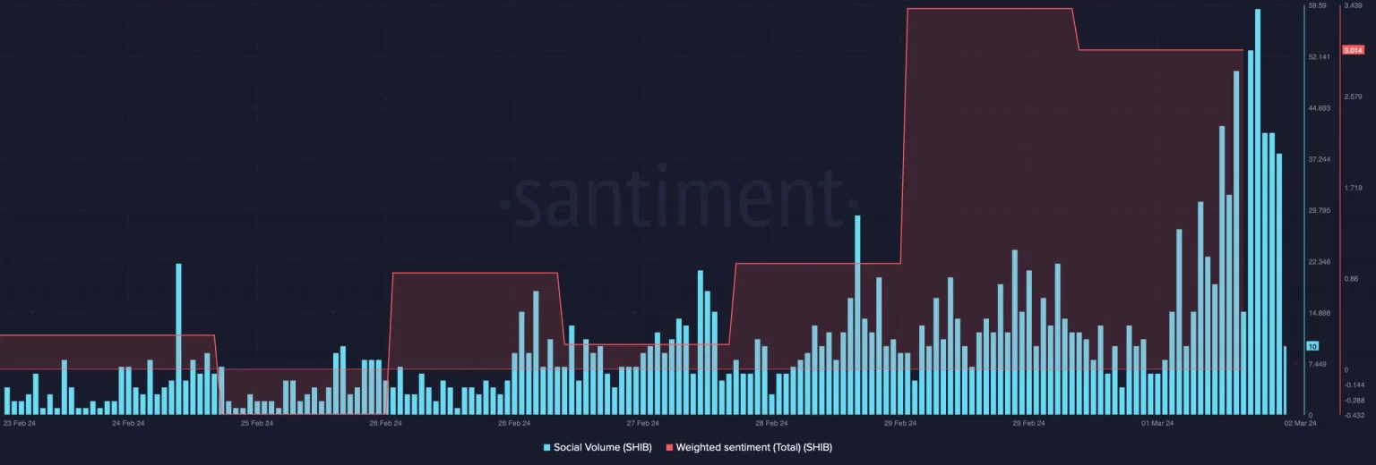 Gracias al aumento de precios, el volumen social de SHIB se disparó. El sentimiento alcista en torno a la moneda meme también aumentó, como se desprende del aumento de su sentimiento ponderado.