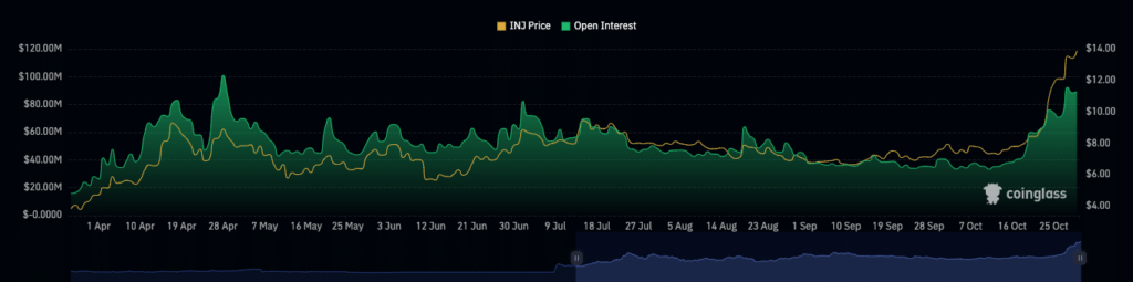 Según los datos de Coinglass, INJ Interes abierto ha ido aumentando desde el 14 de octubre. Un aumento del interés abierto junto con un aumento del precio es una confirmación de una tendencia alcista. Sucede lo contrario cuando el interés abierto disminuye.