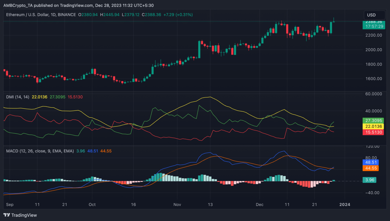 Este cruce a menudo significa un potencial para una nueva tendencia alcista en el activo subyacente. Siempre que esto ocurre, significa que el impulso ascendente está dominando al impulso descendente. Desde el 26 de diciembre, el precio de ETH ha subido un 5%.