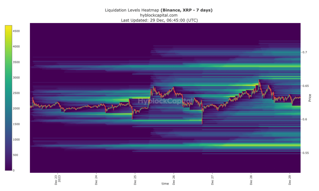 Según el Liquidation HeatMap de XRP, podrían producirse liquidaciones elevadas de alrededor de 0,59 $ a la baja. Por el lado positivo, los riesgos rondaban los 0,68 dólares.
