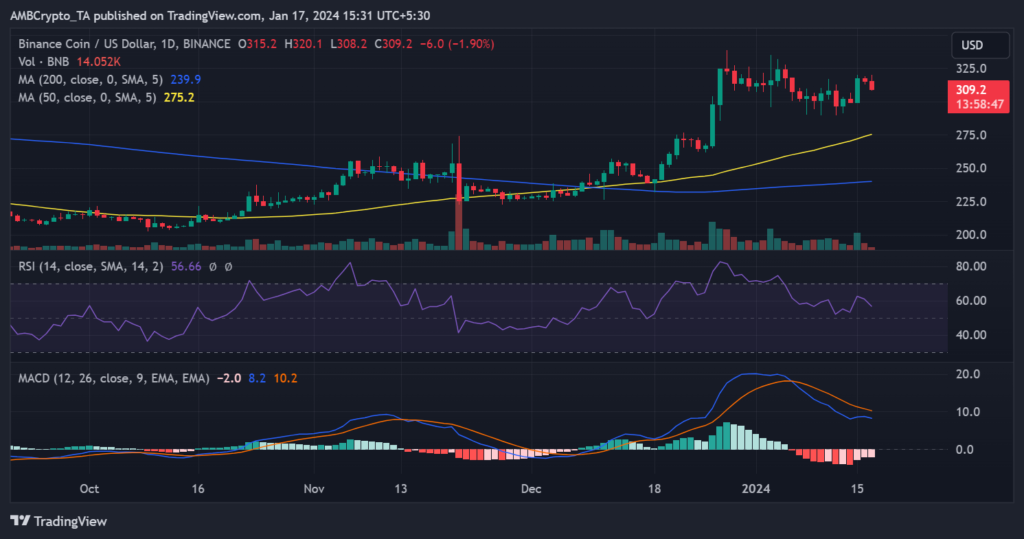 En el momento de escribir este artículo, cotizaba a alrededor de 309 dólares, lo que muestra una disminución de alrededor del 1,8%. La caída en la sesión de negociación anterior fue inferior al 1%, con BNB cotizando a alrededor de 315 dólares.