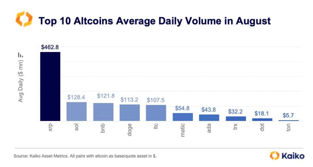 Plagados por un sentimiento negativo, los operadores de XRP se apresuraron a asegurar las ganancias. Según el proveedor de datos del mercado criptográfico Kaiko, XRP registró una actividad comercial significativamente mayor en agosto en comparación con otras alternativas.