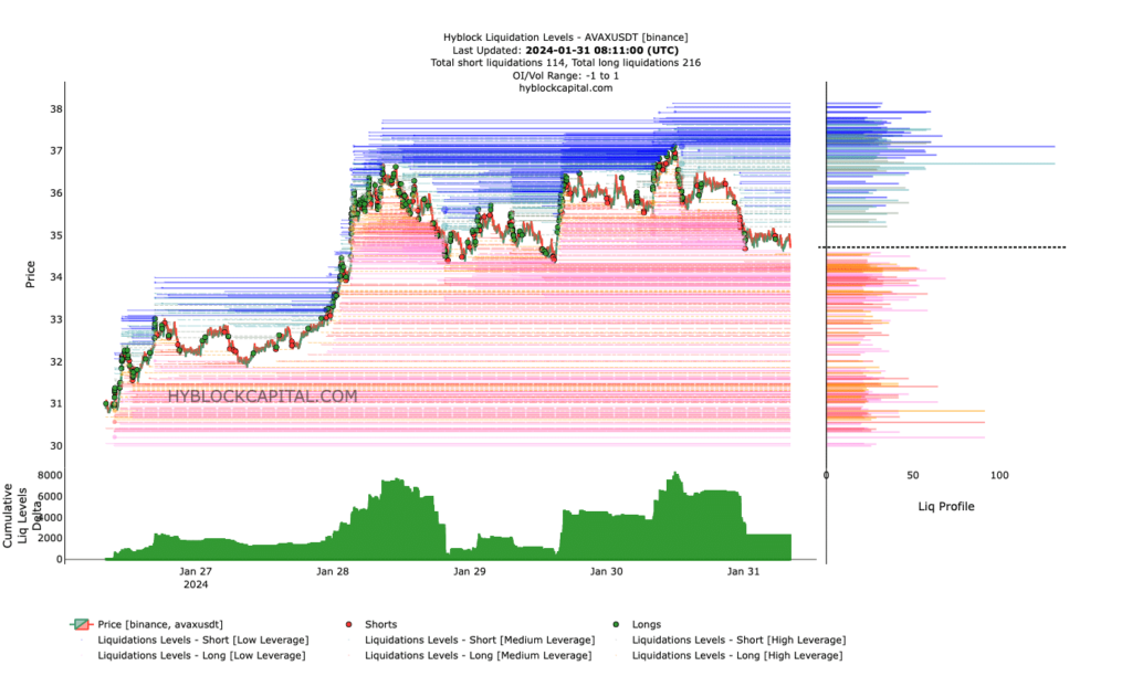 A modo de contexto, los niveles de liquidación muestran los precios estimados donde podría ocurrir un evento de liquidación. Según el gráfico siguiente, AVAX podría avanzar hacia los 37 dólares.