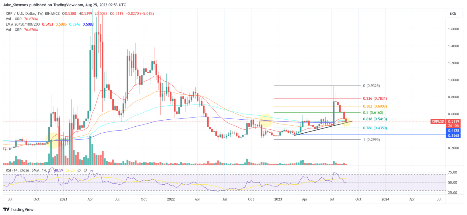 Al 25 de agosto de 2023, XRP se sitúa en 0,5115 dólares. El gráfico semanal revela la tan debatida cruz dorada, un fenómeno en el que una media móvil de corto plazo supera a una de largo plazo, lo que a menudo insinúa un cambio de una tendencia bajista a una alcista. En el caso de XRP, la EMA de 50 semanas se ha movido por encima de la EMA de 200 semanas.