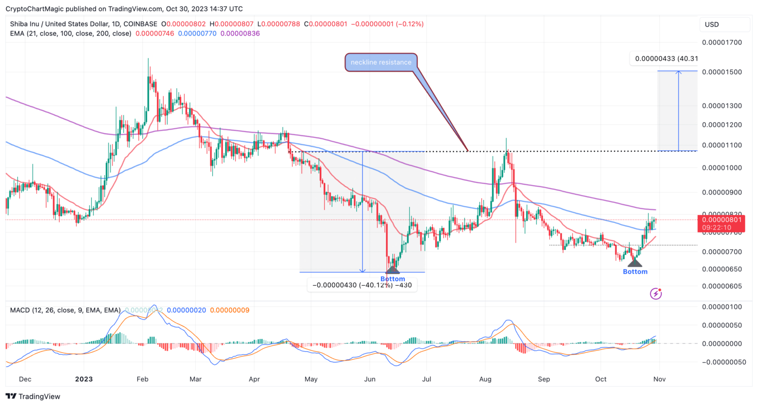 Shiba Inu reforzó su estructura técnica en octubre y ahora se sitúa entre dos indicadores determinantes; la media móvil exponencial (EMA) de 100 días (azul) en 0,0000077 dólares y la EMA de 200 días (púrpura) en 0,00000836 dólares.