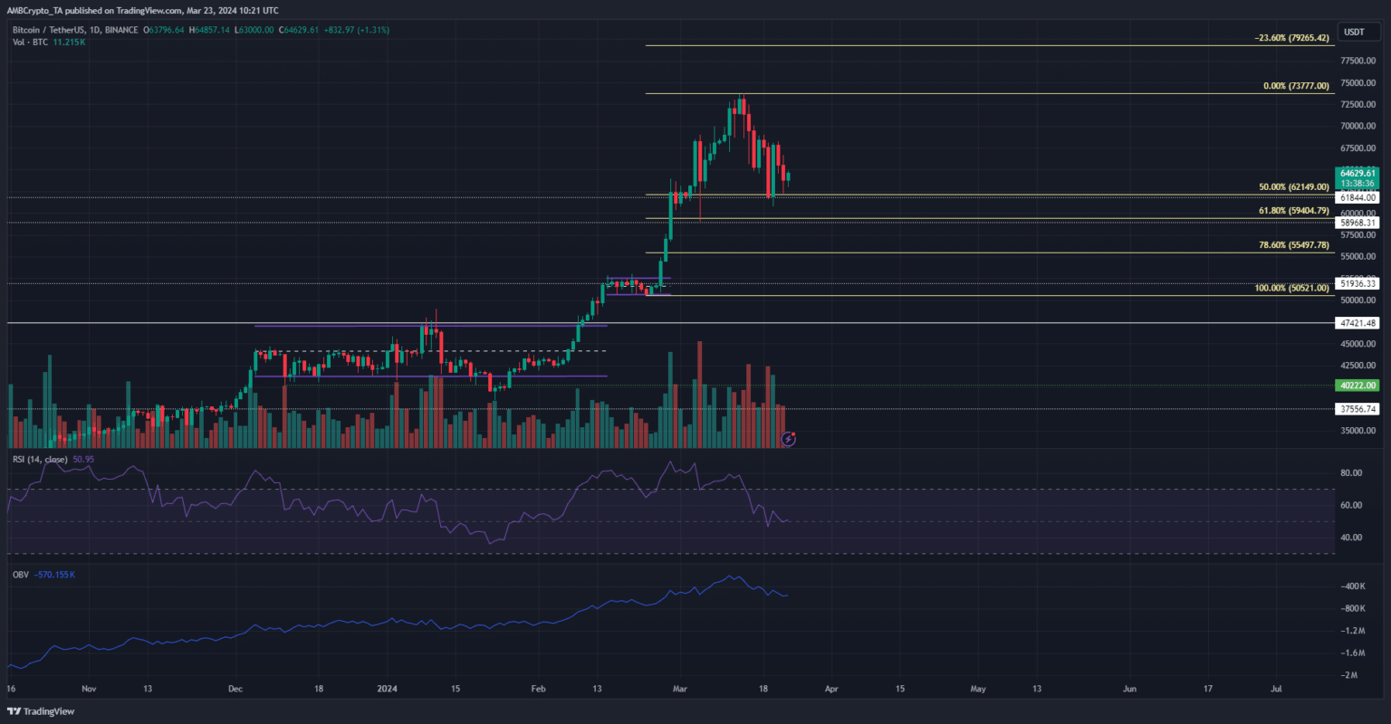 La estructura del mercado de un día de BTC fue alcista. Un movimiento por debajo de 50.500 dólares lo convertiría en bajista, mientras que un movimiento por encima de 73.700 dólares indicaría una continuación alcista. En el momento de esta edición, los niveles de retroceso de Fibonacci de 59,4 mil dólares y 55,5 mil dólares (amarillo pálido) eran niveles de soporte importantes.