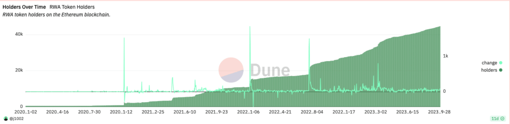 Ejemplos de estos tokens incluyen GFI, FACTR, ONDO, entre otros. Además, hay alrededor de 44.700 poseedores de tokens RWA, y más de 25.000 de este número se unieron en los últimos 365 días.