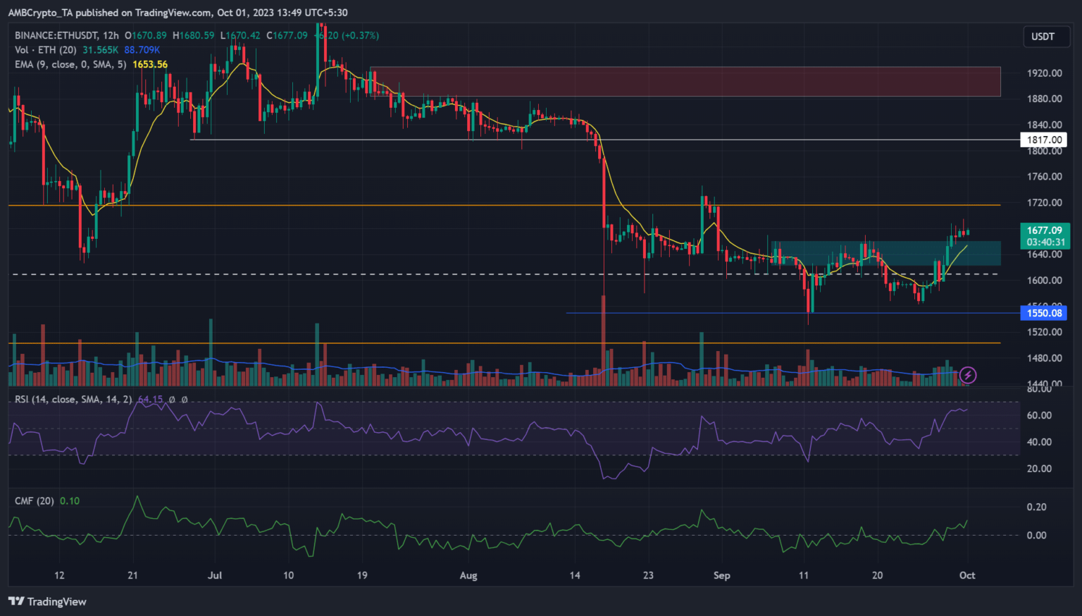 El bloque de orden bajista de $1623 – $1660 (cian) ha sido un obstáculo clave y un nivel de resistencia en septiembre. Sin embargo, ETH se elevó por encima de él en el momento de la publicación, lo que hizo que la estructura del mercado del primer semestre se volviera alcista y favoreciera a los alcistas.