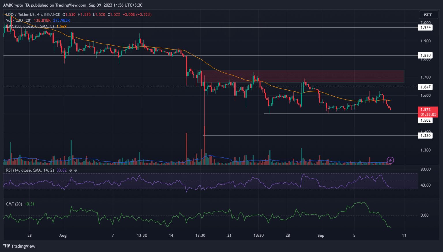 Piscina [LDO] La evolución de los precios se mantuvo débil en septiembre, ya que el mercado registró una baja volatilidad. Fluctuó por encima de 1,5 dólares durante el mismo período, lo que subraya que el nivel es un soporte clave a corto plazo.