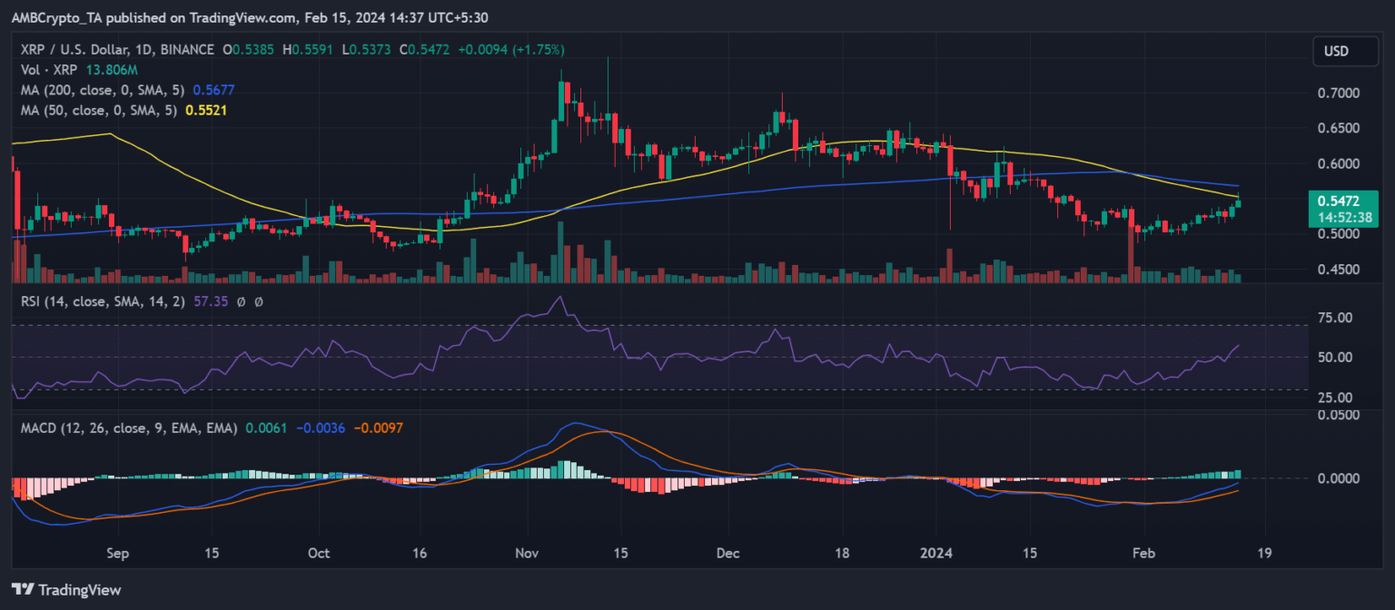 Durante los últimos dos días, XRP inició un repunte, lo que llevó a un precio más alto en comparación con las semanas anteriores. Al cierre de operaciones del 13 de febrero, había aumentado un 2,45%, alcanzando alrededor de 0,53 dólares.