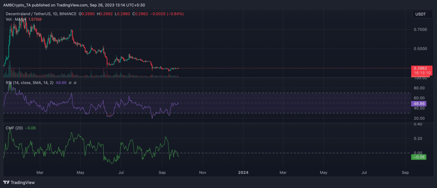 Sin embargo, incluso después de 24 horas, el precio de MANA no reaccionó. El token se cotizaba a 0,29 dólares al momento de esta publicación, creciendo solo un 1%. Con el mercado considerablemente “entrecortado” durante el último mes, el precio del alt ha oscilado entre $0,31 y $0,29 en los últimos 30 días.