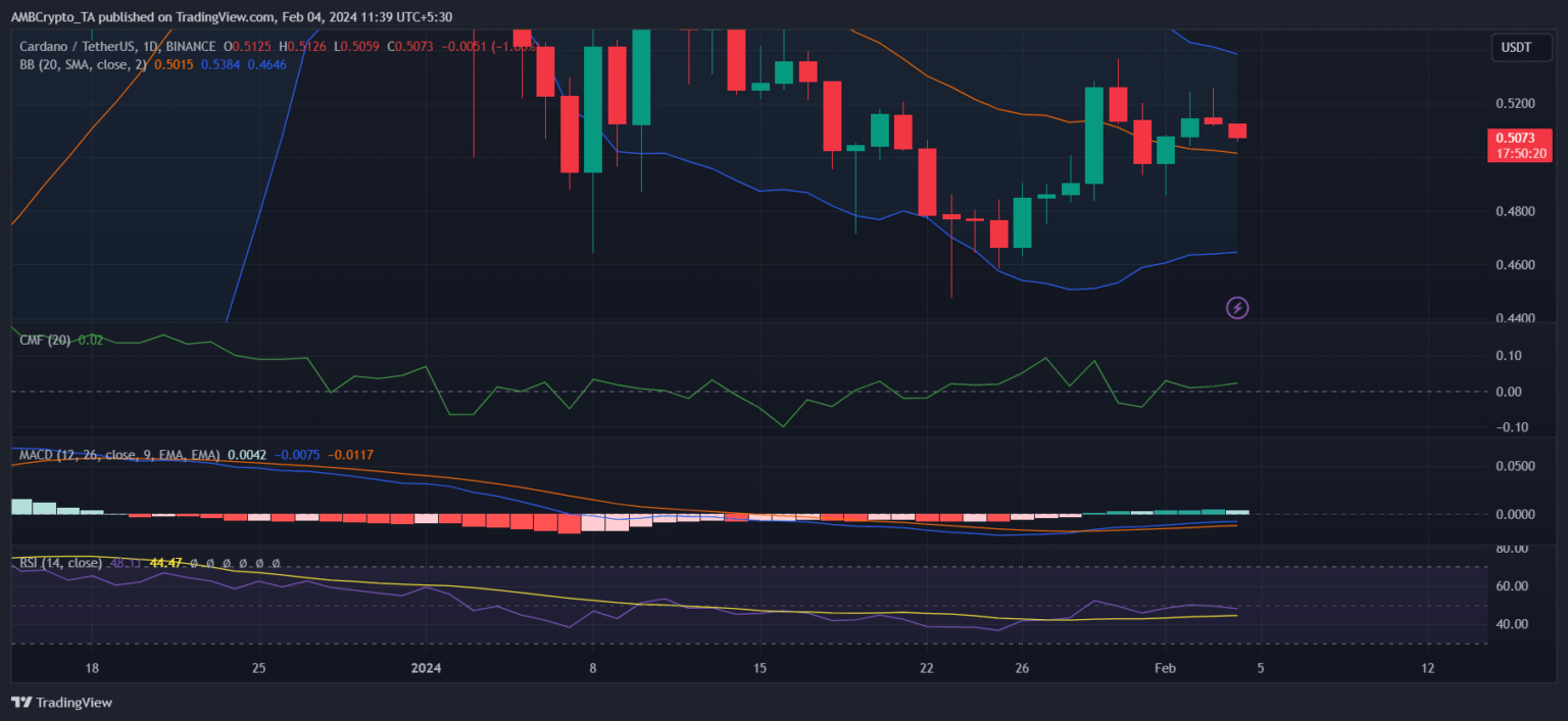 Cardano [ADA] El precio fue testigo de una prometedora tendencia alcista la semana pasada cuando su gráfico se volvió verde. Sin embargo, tras alcanzar su punto más alto la semana pasada, el 30 de enero, su precio empezó a bajar.