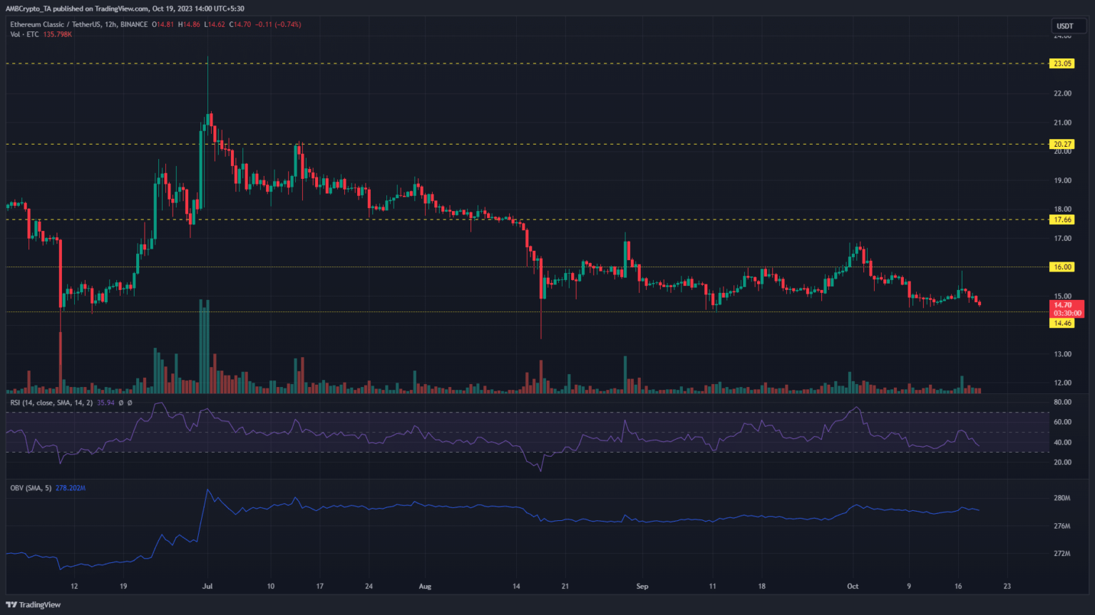 Ethereum clásico [ETC] Las perspectivas a corto plazo de un repunte alcista no lograron superar el obstáculo de resistencia de 16 dólares. Esto resultó en una caída del 7,5% que llevó a ETC hacia el nivel de soporte de $14,46.