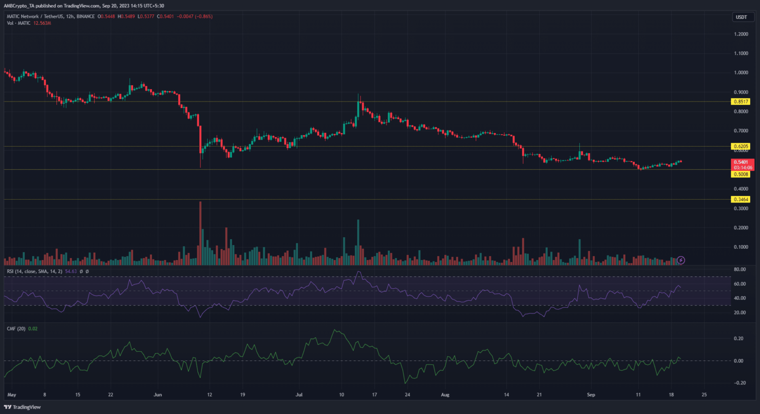 El gráfico de 12 horas de MATIC reveló un enfoque alcista conservador pero sostenido hacia el rebote de precios. Después del suave rebote desde el soporte de 0,5 dólares, MATIC registró ganancias del 10,9% entre el 12 y el 19 de septiembre.