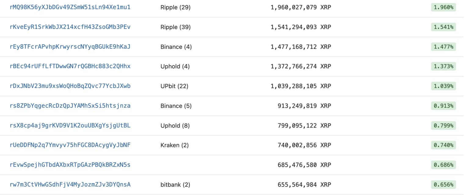 La mayor parte de las monedas XRP está en manos de Ripple, el presidente ejecutivo Chris Larsen y el director ejecutivo Brad Garlinghouse, quienes fueron absueltos de todos los cargos por la Comisión de Bolsa y Valores de EE. UU. (SEC) en octubre. Vale la pena mencionar que los intercambios de cifrado, como BinanceKraken, Uphold y Bitbank también poseen cantidades significativas de XRP.