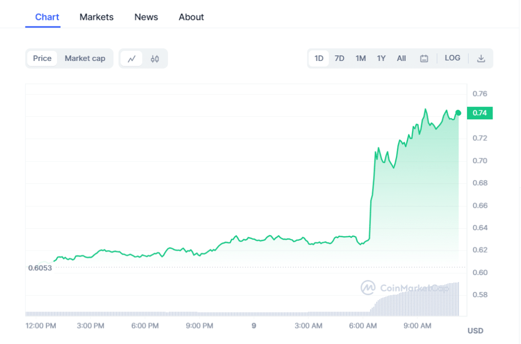 En el momento de escribir este artículo, uno de los que más ganó hoy fue el token MINA, que experimentó un aumento de precio del 22,59% en las últimas veinticuatro horas, alcanzando los 0,7455 dólares. Además, el volumen de operaciones experimentó un aumento sustancial de un enorme 591%, alcanzando más de 226 millones. El aumento de precios previsto parece estar alineado con el reciente anuncio hecho por la comunidad de Mina de realizar una mejora importante, ya que marcó el final de la Época 1.