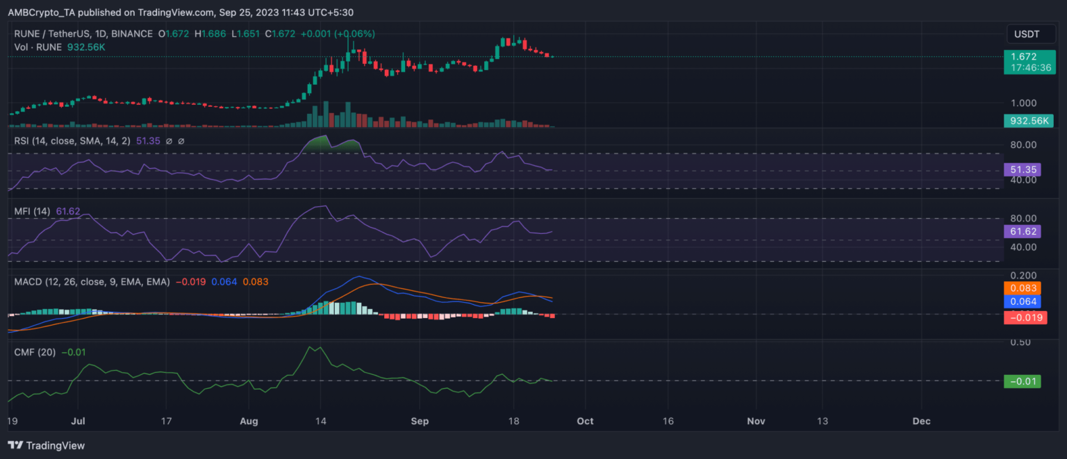 Además, la distribución de RUNE ha superado su acumulación, y sus indicadores clave de impulso apuntan hacia el sur, lo que sugiere que es probable que la tendencia bajista continúe.