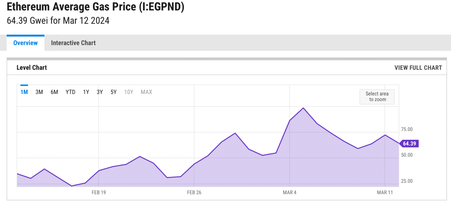 Una posible razón detrás de este aumento podría ser el aumento en el precio del gas de ETH, que se situó en 64,39 Gwei por Gráficos Y.