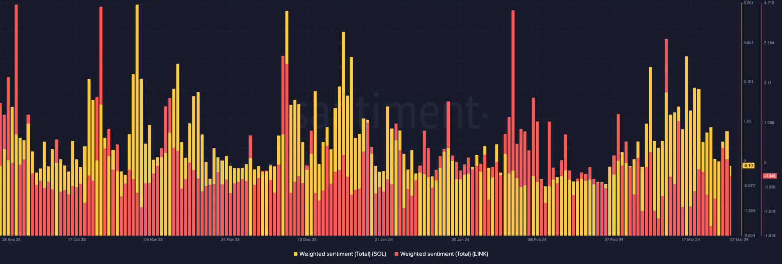 Cuando se trata de sentimiento En torno a ambos proyectos, descubrimos que eran similares. Al cierre de esta edición, el sentimiento ponderado en torno a SOL era negativo. El sentimiento de Chainlink era casi indistinguible del de su homólogo.