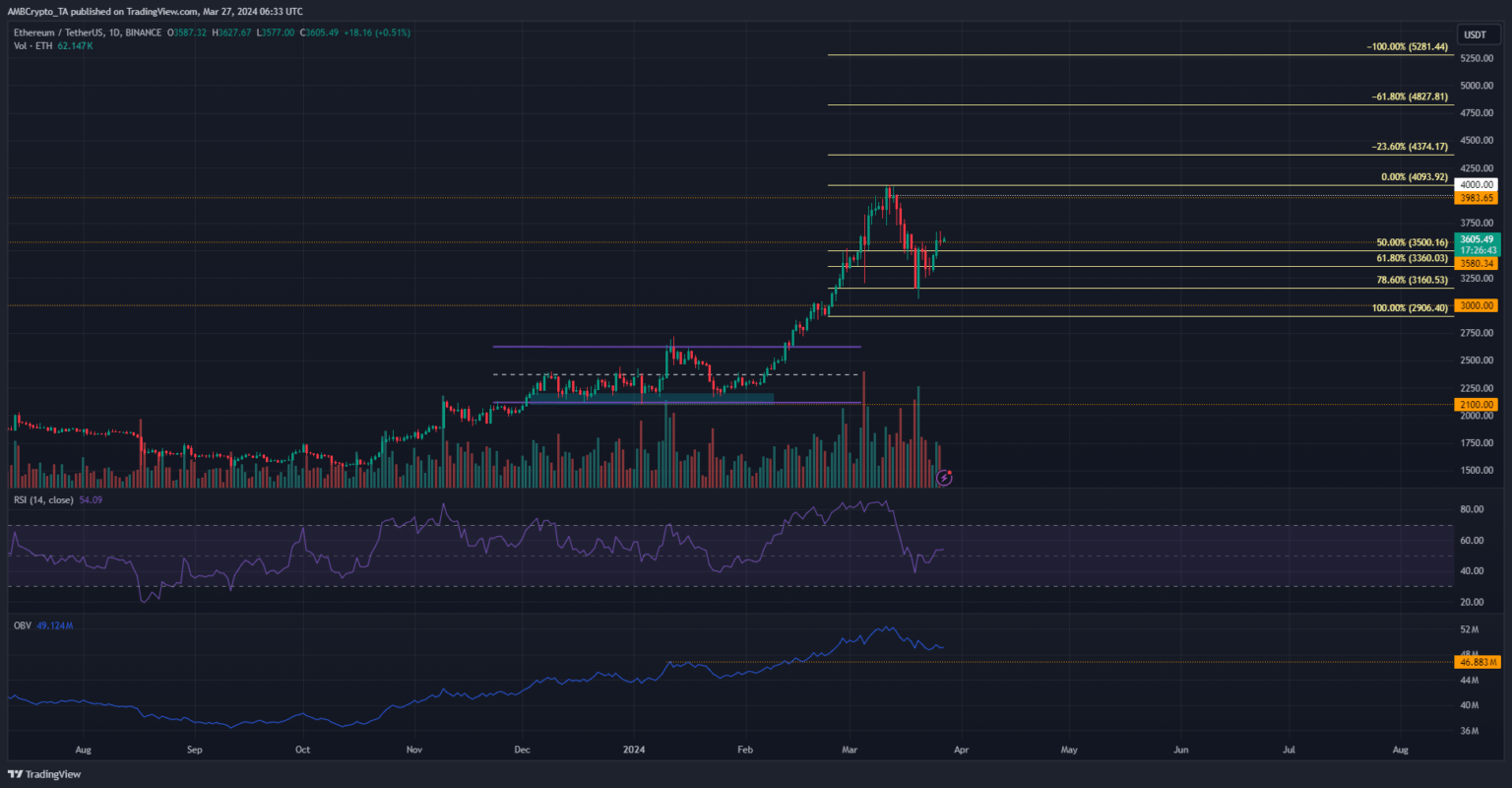 El volumen de ventas en marzo fue significativo, pero no suficiente para derrocar a los compradores. Los niveles de retroceso de Fibonacci (amarillo pálido) mostraron que los $3160 eran un nivel de soporte crítico.