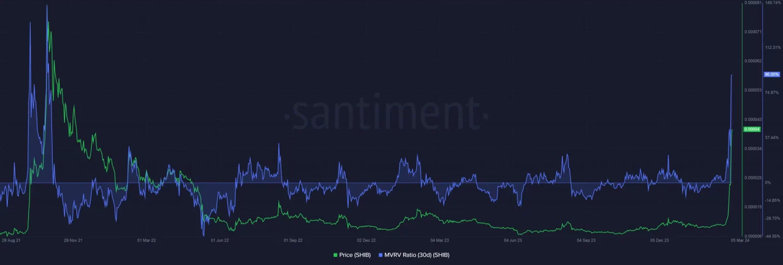 El atractivo de mayores rendimientos estaba atrayendo a un enjambre de comerciantes ávidos de ganancias. Al momento de escribir este artículo, los titulares de SHIB tenían ganancias no realizadas de más del 90% en sus inversiones en promedio, reveló el análisis de AMBCrypto de los datos de Santiment.