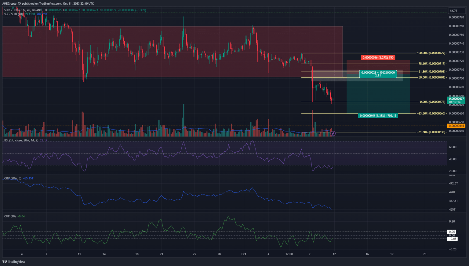 La estructura del mercado H4 de Shiba Inu fue fuertemente bajista. El índice de fuerza relativa (RSI) estaba en 27 y señaló un fuerte impulso a la baja. El volumen en equilibrio (OBV) tuvo una tendencia a la baja en octubre y el flujo de dinero de Chaikin (CMF) a menudo ha caído por debajo de -0,05. Esto indicó un importante flujo de capital fuera del mercado SHIB.