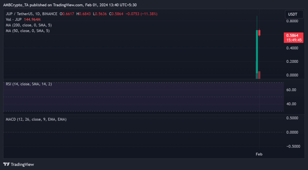 El análisis de AMBCrypto del token JUP mostró que abrió su operación en alrededor de $0,03. El token experimentó un aumento, alcanzando los 0,8 dólares antes de concluir cotizando en alrededor de 0,66 dólares.