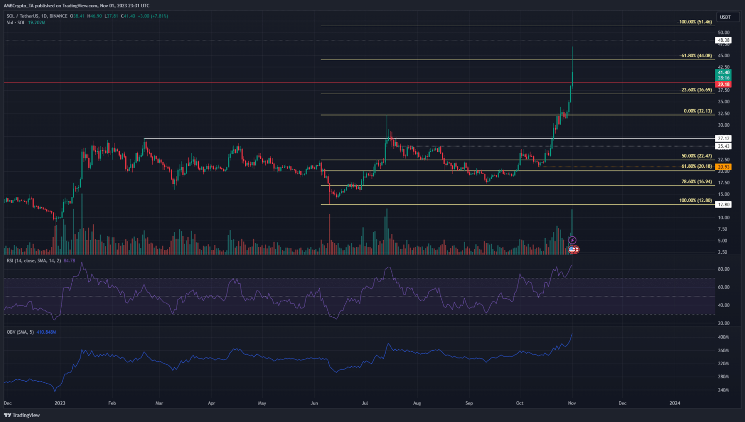 El gráfico semanal reveló que la región de $38-$50, que había servido como resistencia en agosto de 2022, podría plantear problemas a los compradores una vez más. Si 50 dólares se convertían en soporte, era probable que SOL pudiera subir a 80 dólares y 105 dólares a continuación.