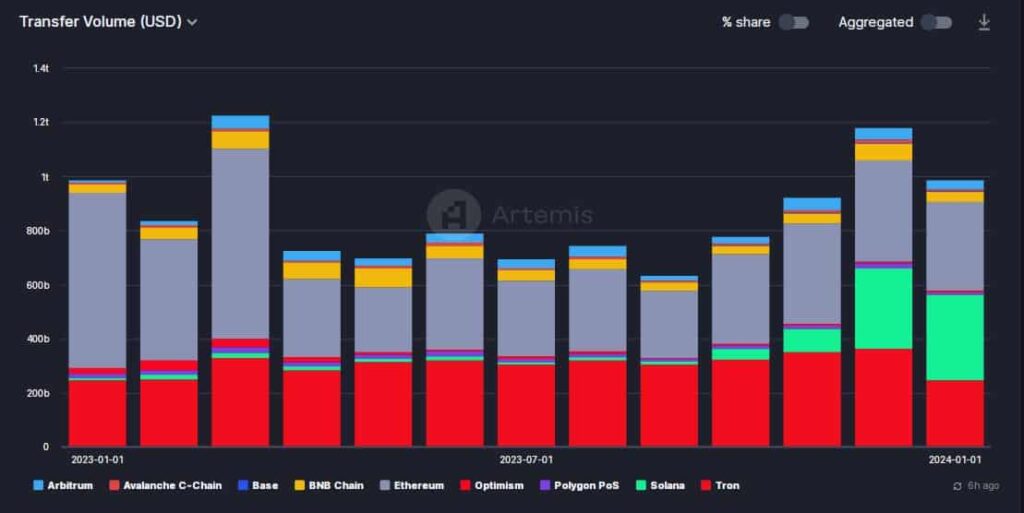 De hecho, apenas la semana pasada, Artemis reconoció en un Publicación X (anteriormente Twitter) que los volúmenes de USDC en Solana fueron los principales impulsores del aumento de los volúmenes generales de transferencia de monedas estables.