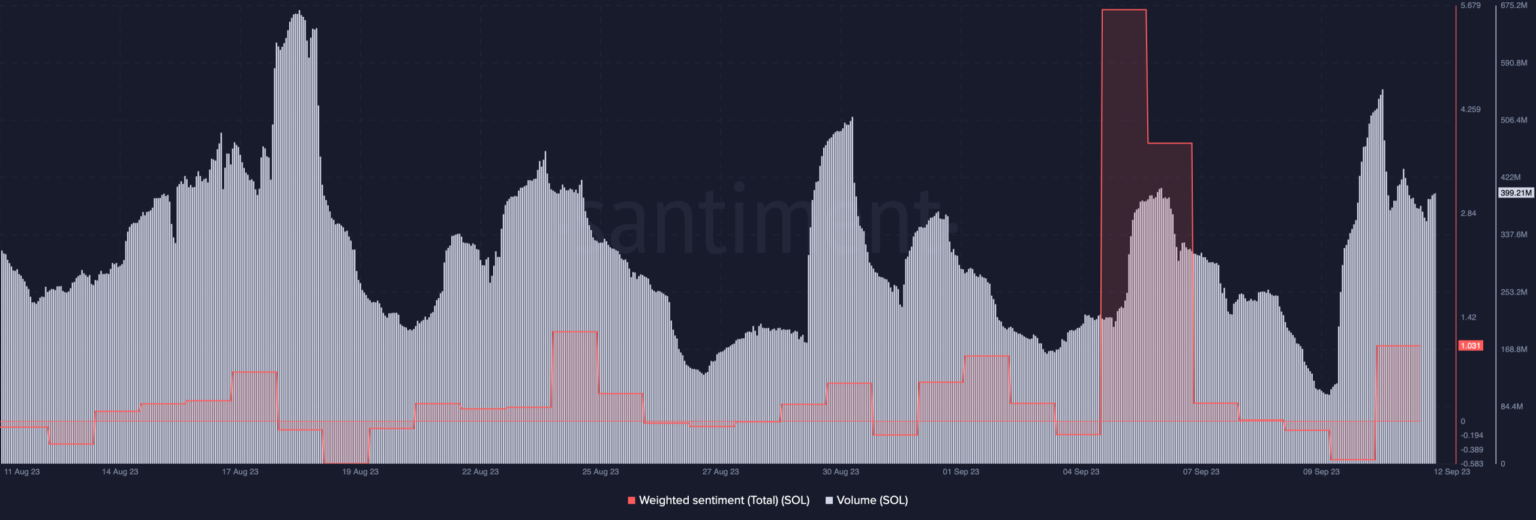 En el momento de escribir este artículo, el sentimiento ponderado de Solana había saltó en la región positiva. Anteriormente, la misma métrica cayó a -0,546. Sin embargo, la recuperación hasta 1,031 sugiere que los actores del mercado creen que el caída de los precios sólo duraría el corto plazo.