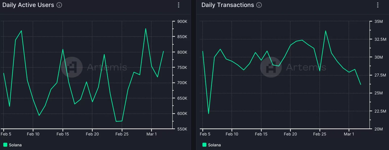 La actividad de la red también fue alta en marzo porque sus direcciones activas diarias se mantuvieron altas. Sin embargo, fue sorprendente ver que, a pesar del aumento en las direcciones activas diarias, las transacciones diarias de Solana disminuyeron en las últimas semanas.